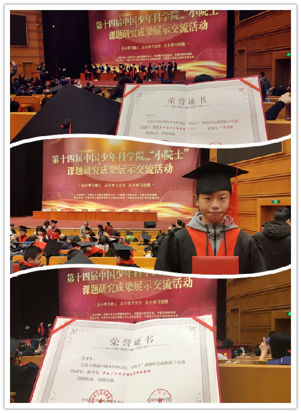 本次答辩活动共包括学生素质测试和课题研究答辩两个环节,从发明创造、科学探究、社会调查和创新创意四个方面综合考查参赛选手的科学素养。经过系统的指导训练、科学的实践研究,实验中学学子凭借过硬的科学素养,在与来自全国的一千六百余名学生的激烈角逐中脱颖而出,取得了优异的成绩:金柯岑同学凭借课题《坐姿调整型台灯的创意与思考》荣获本次活动一等奖,并被聘为“中国少年科学院小院士”。